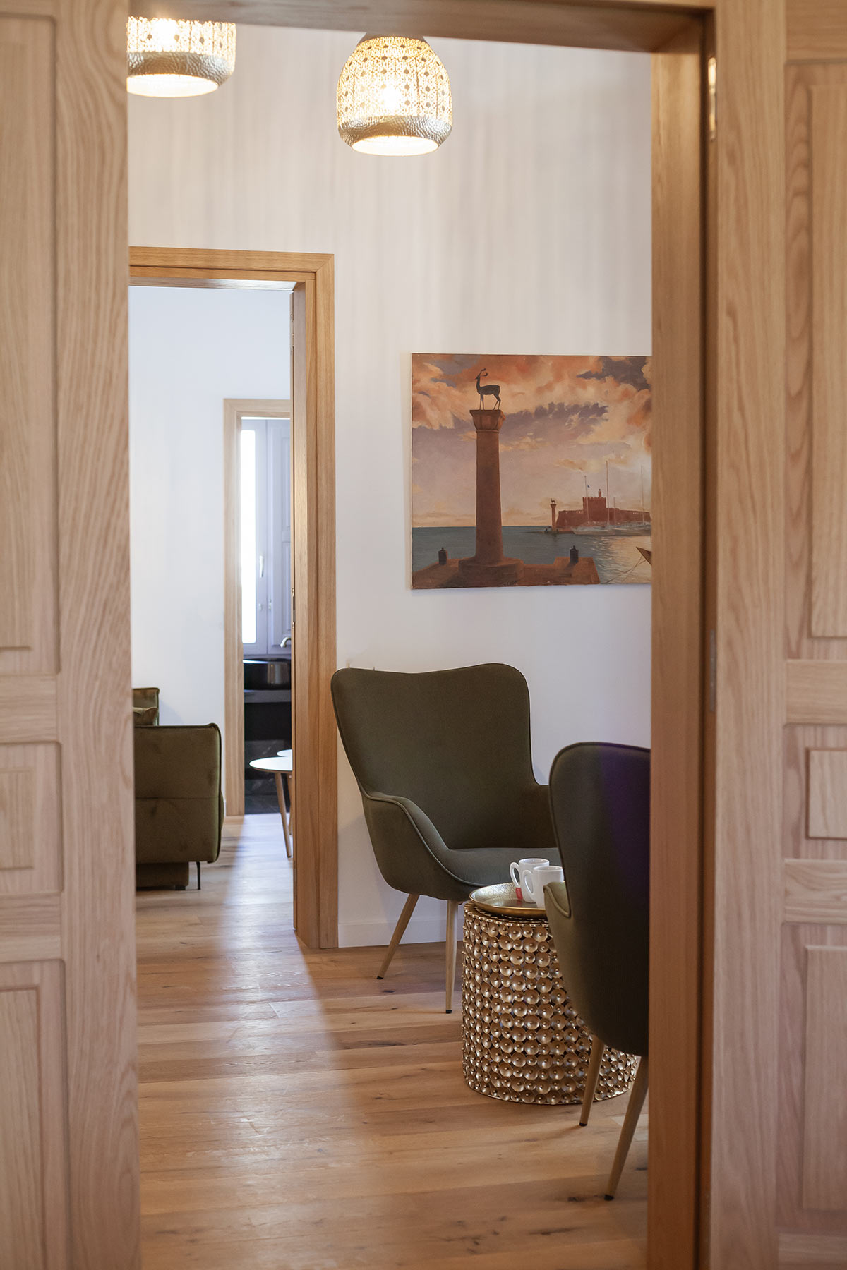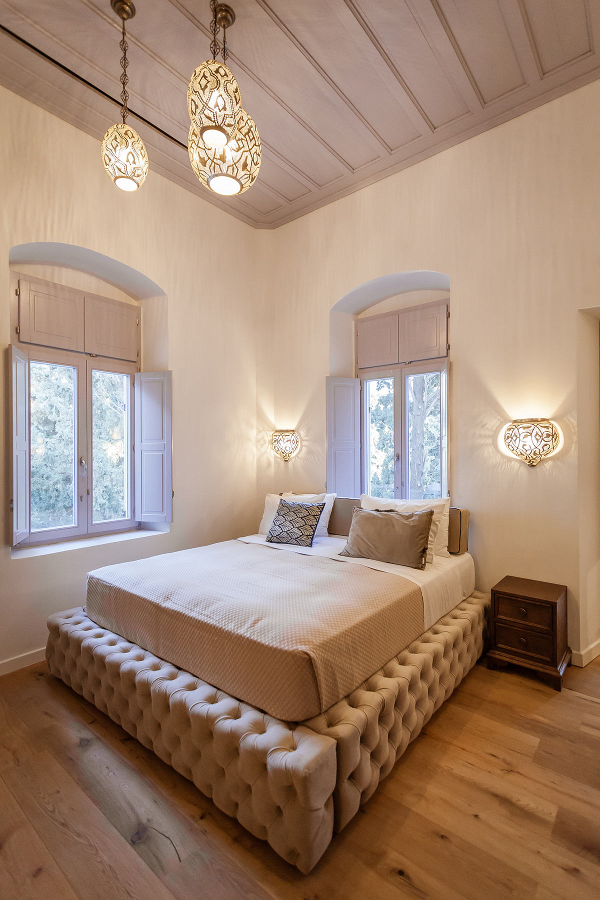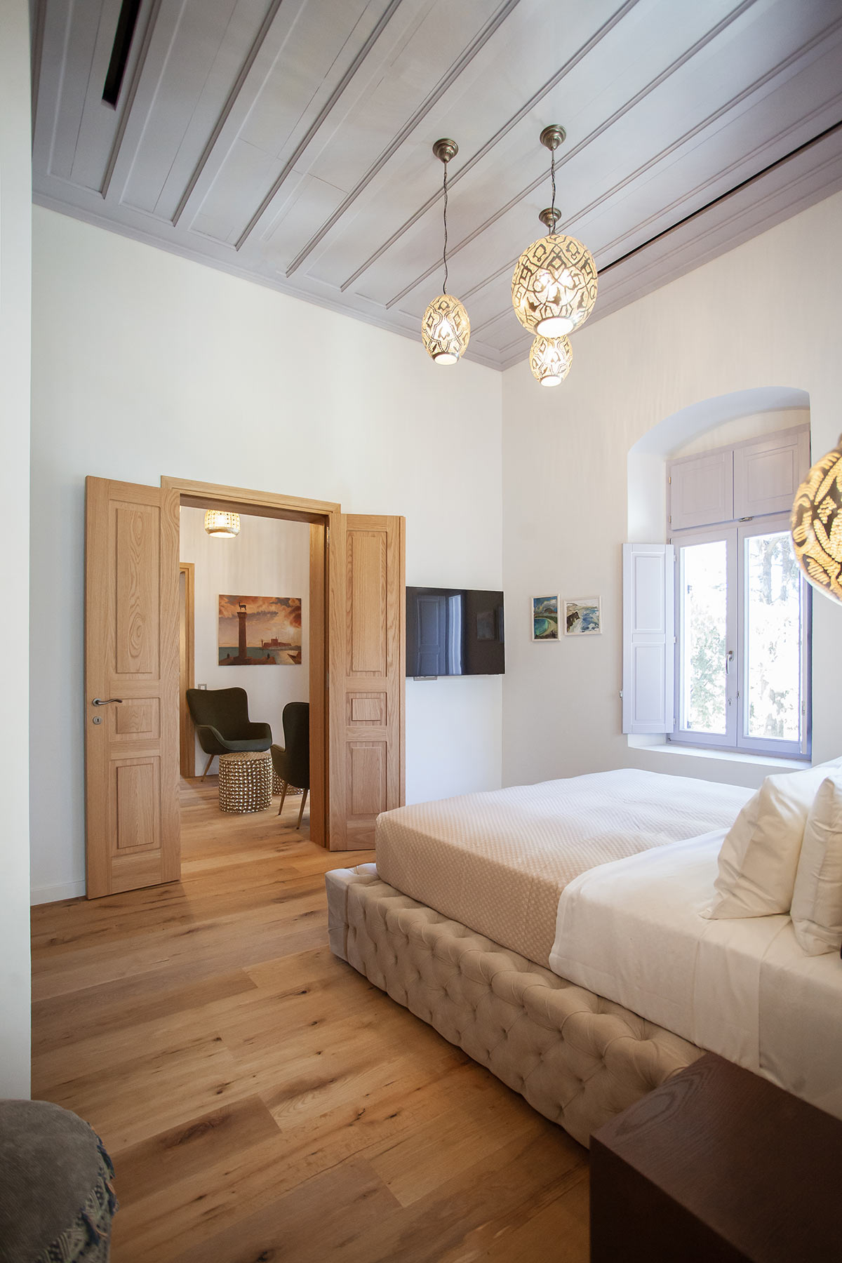 Once the mansion’s grand living room, this impressive suite retains its neoclassical charm with high ceilings, ornate details, and stately proportions. Ideal for families, it offers generous space, sophisticated furnishings, and a serene atmosphere. With an authentic sachnisi - a traditional, enclosed wooden balcony, a marble bathroom and hardwood floors, the Sachnisi Family Suite invites you to experience Rhodes in style.