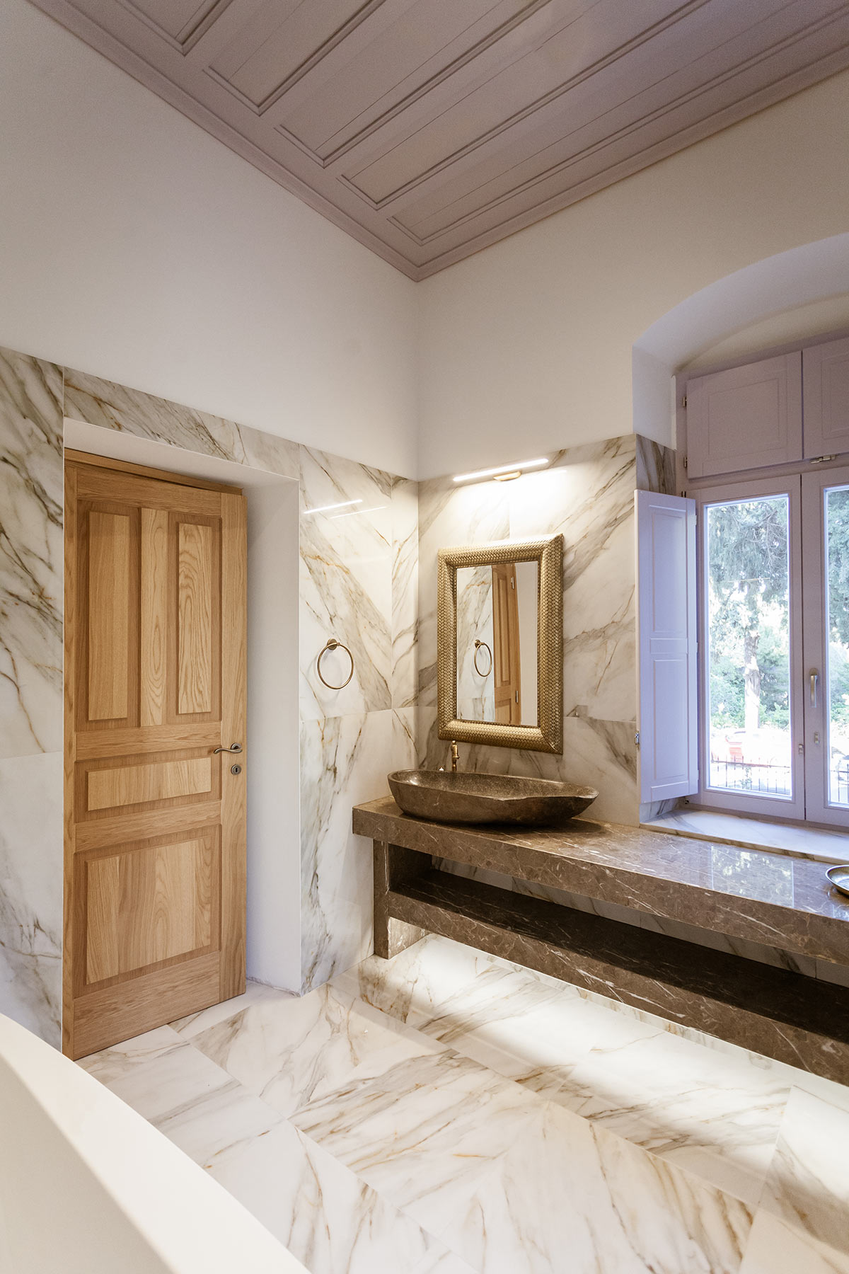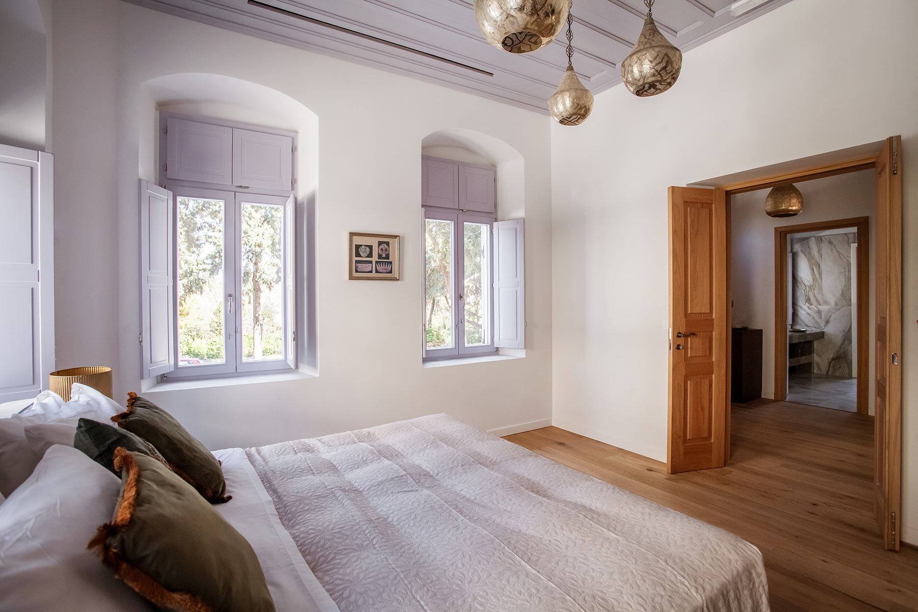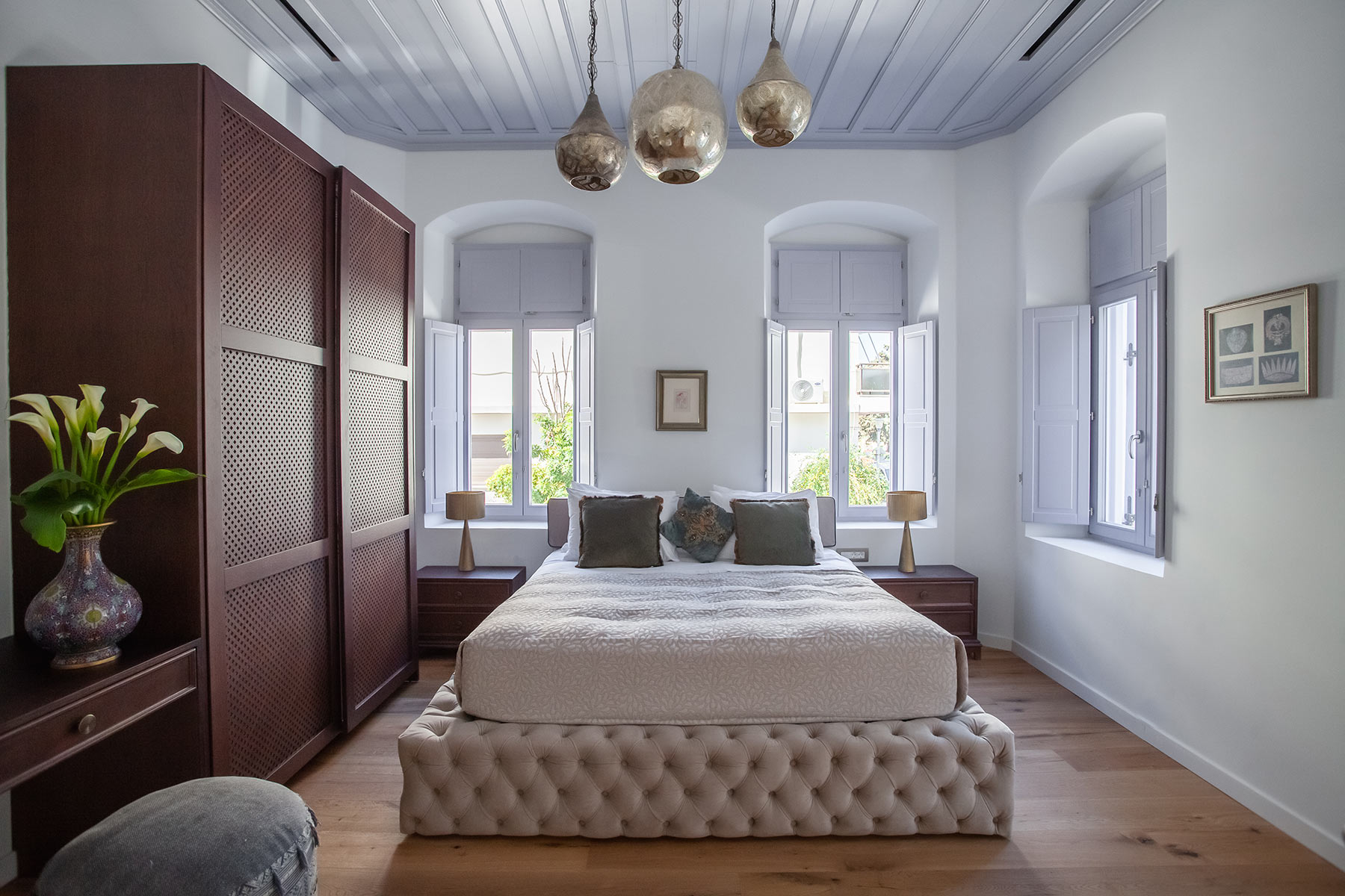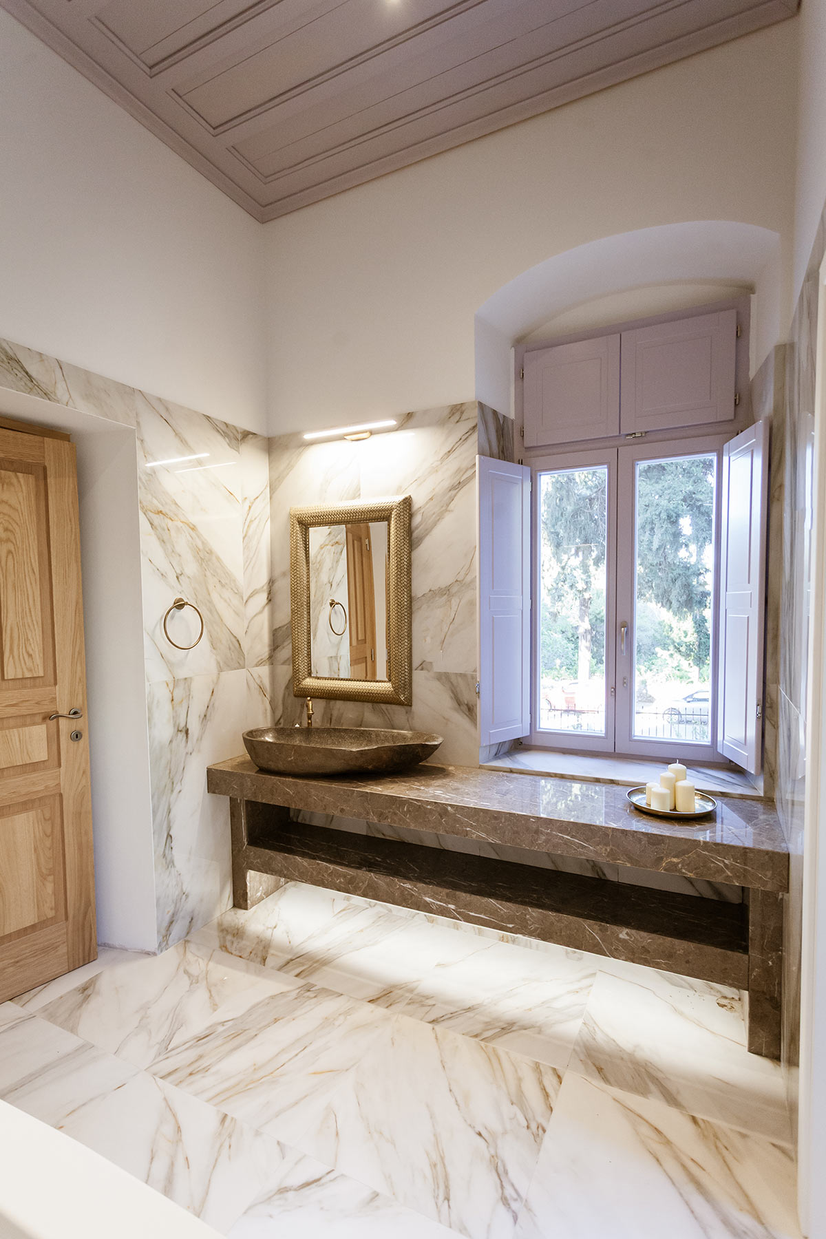 Inspired by the rituals of relaxation it once hosted, the Hammam Room is housed in the repurposed old steam room of the mansion. Rich textures, warm tones, and handcrafted details create a cocoon of comfort, while contemporary amenities complete this uniquely luxurious retreat within the historic charm of Aylin Luxury Suites.